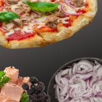 Tomatensoße, Mozzarella, Thunfisch, Zwiebeln, Olivenöl